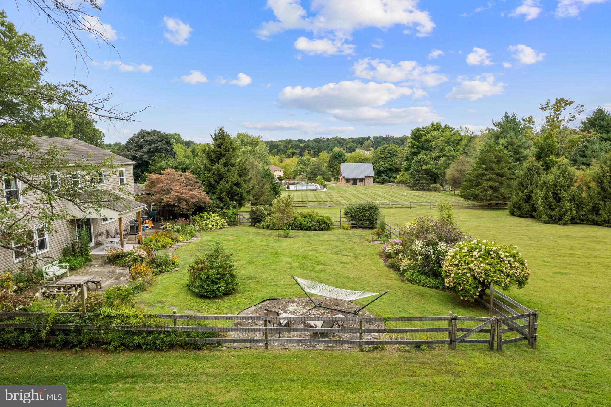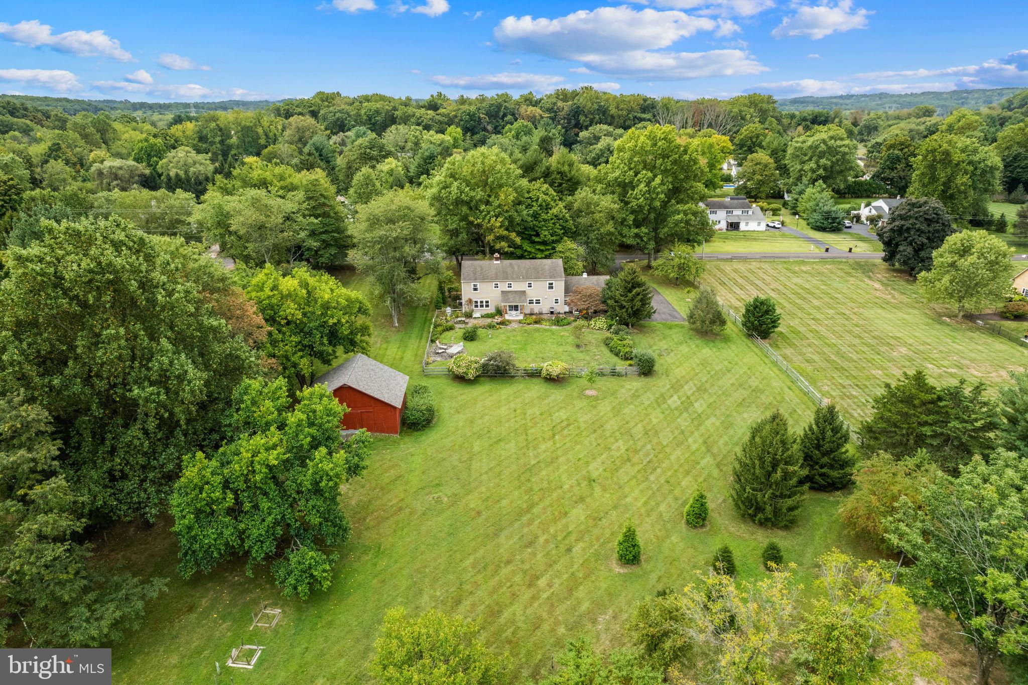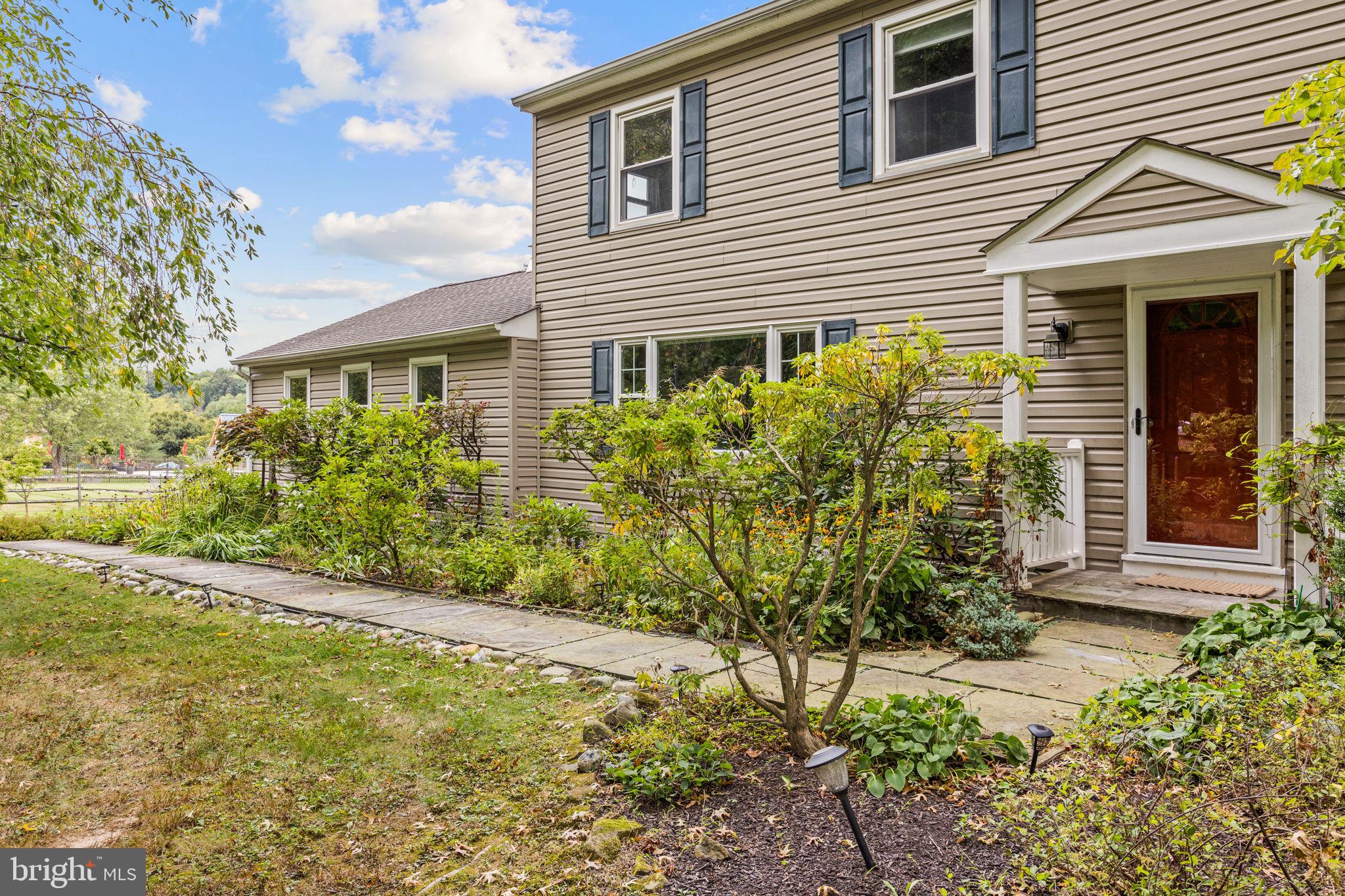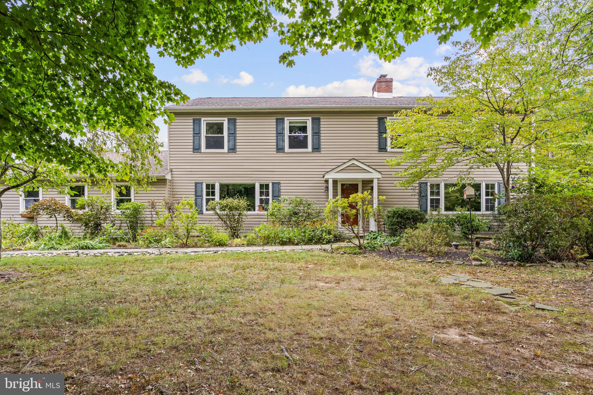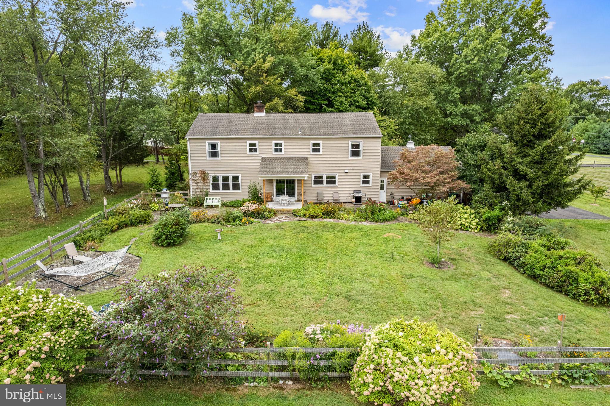 Drive down a quiet country road to be greeted by this charming colonial nestled on over 2 acres of tranquil Bucks County land. Conveniently located within Solebury Township for an easy commute, this 5 bed, 3 bath home warmly welcomes you from the time you step inside. As you approach the front of the home, you will admire the flagstone walkway, colorful garden beds and mature trees, which all contribute to its intriguing curb appeal. Enter the spacious foyer adorn with custom corner bookshelves to find a meticulously maintained interior featuring original hardwood floors and neutral tones. The entrance is flanked by the cozy living room boasting a brick wood burning fireplace and sizeable dining room, both decorated with custom crafted built-ins. Discover many noteworthy features as you make your way around the amazing space including the wide entrance ways, special wall enhancements and the abundant natural light from the perfectly positioned windows and doors. The open gourmet kitchen, with its serene garden views, opens through a set of French doors to a large patio area, creating a seamless flow between indoor and outdoor living. The eat-in kitchen is a chef's dream, boasting rich cabinetry, attractive quartz countertops, a butcher block topped center island, coordinating tile backsplash, new gas range and a useful pantry closet for storage. Adjacent, the family room with its second wood burning fireplace, offers a warm and inviting space to gather or unwind after a long day, especially during the crisp evenings. A hallway off the kitchen houses a convenient laundry room, full bath, and second entryway with easy access to the 2-car garage and backyard rounding out the main level. Retreat upstairs to the roomy primary suite with ample closet space and ensuite full bath featuring tile flooring, newly updated vanity, walk-in shower and dressing area. Four additional bedrooms, each sharing a remodeled stylish hall bathroom complete the second floor. The lower level, currently used for a gym, provides additional living space and awaits your ideas! Outside, the fully fenced-in backyard is surrounded by mature landscape for character and privacy while a sizable patio invites you to relax and enjoy the sounds of nature and tranquility. A neighboring barn on the property offers versatility--originally utilized for raising horses this space would be ideal for a car enthusiast, handyman's workshop or simply extra storage for lawn equipment and more. Come and explore the timeless appeal of this home and the serene surroundings where charm meets modern convenience and custom finishes elevate every room.
