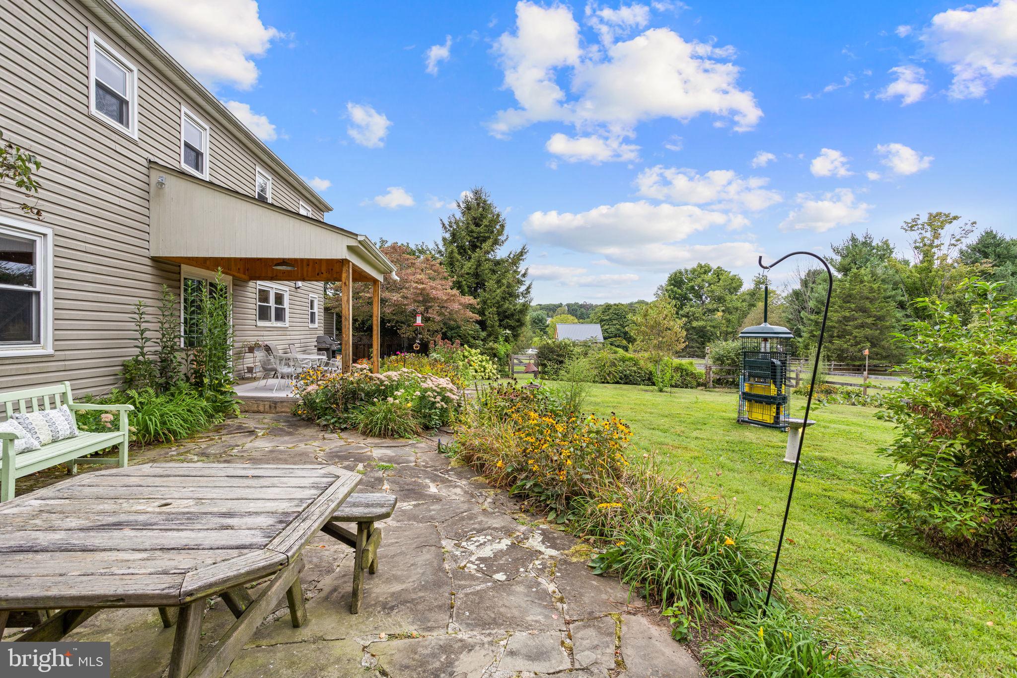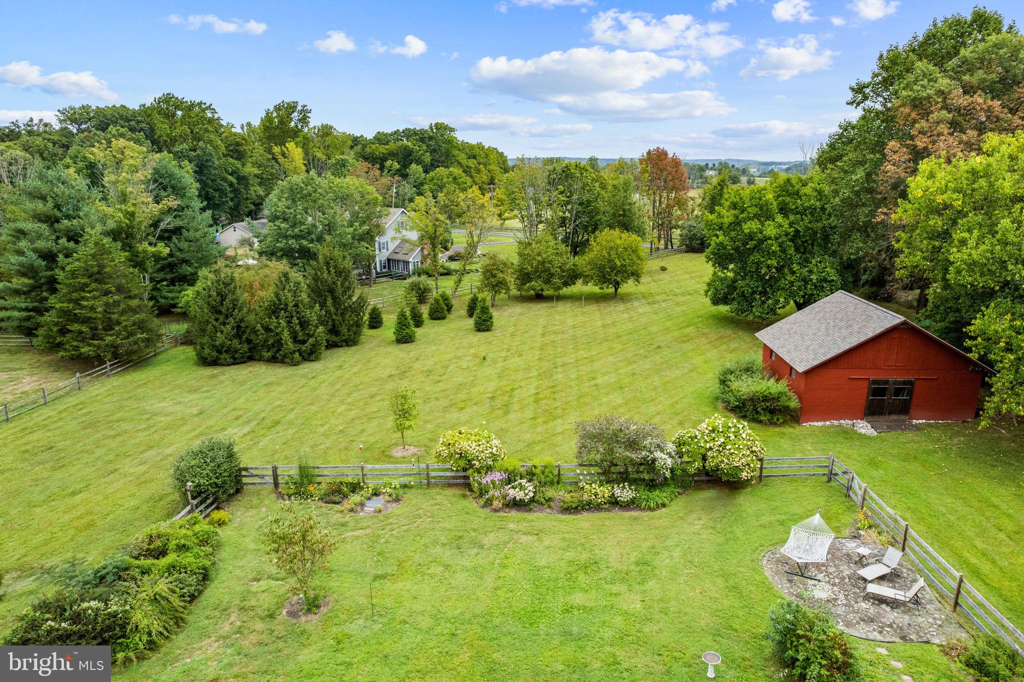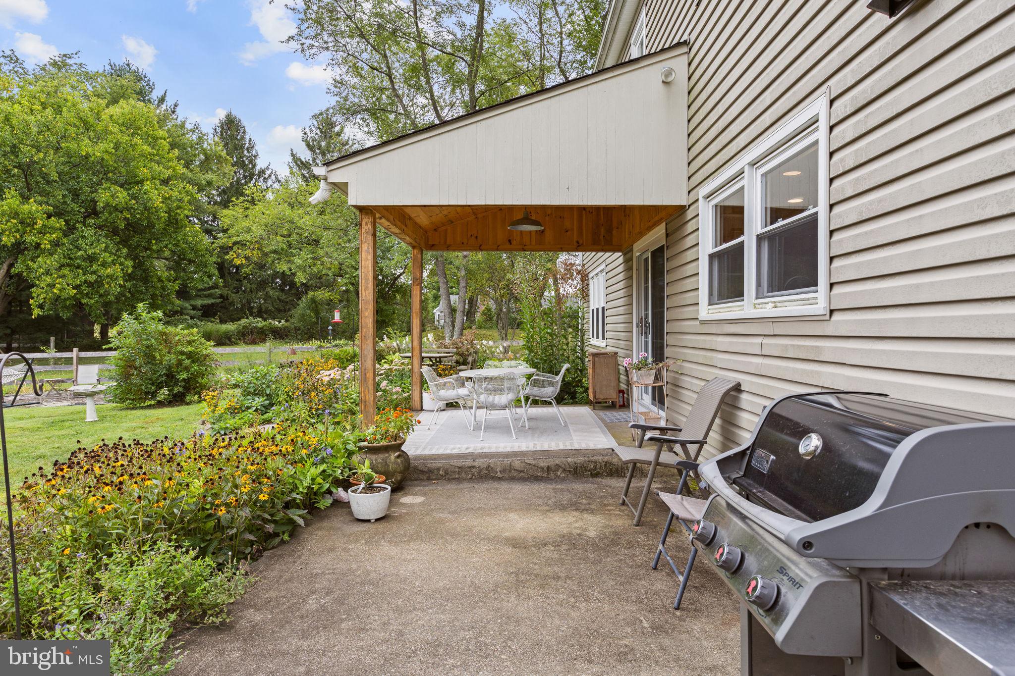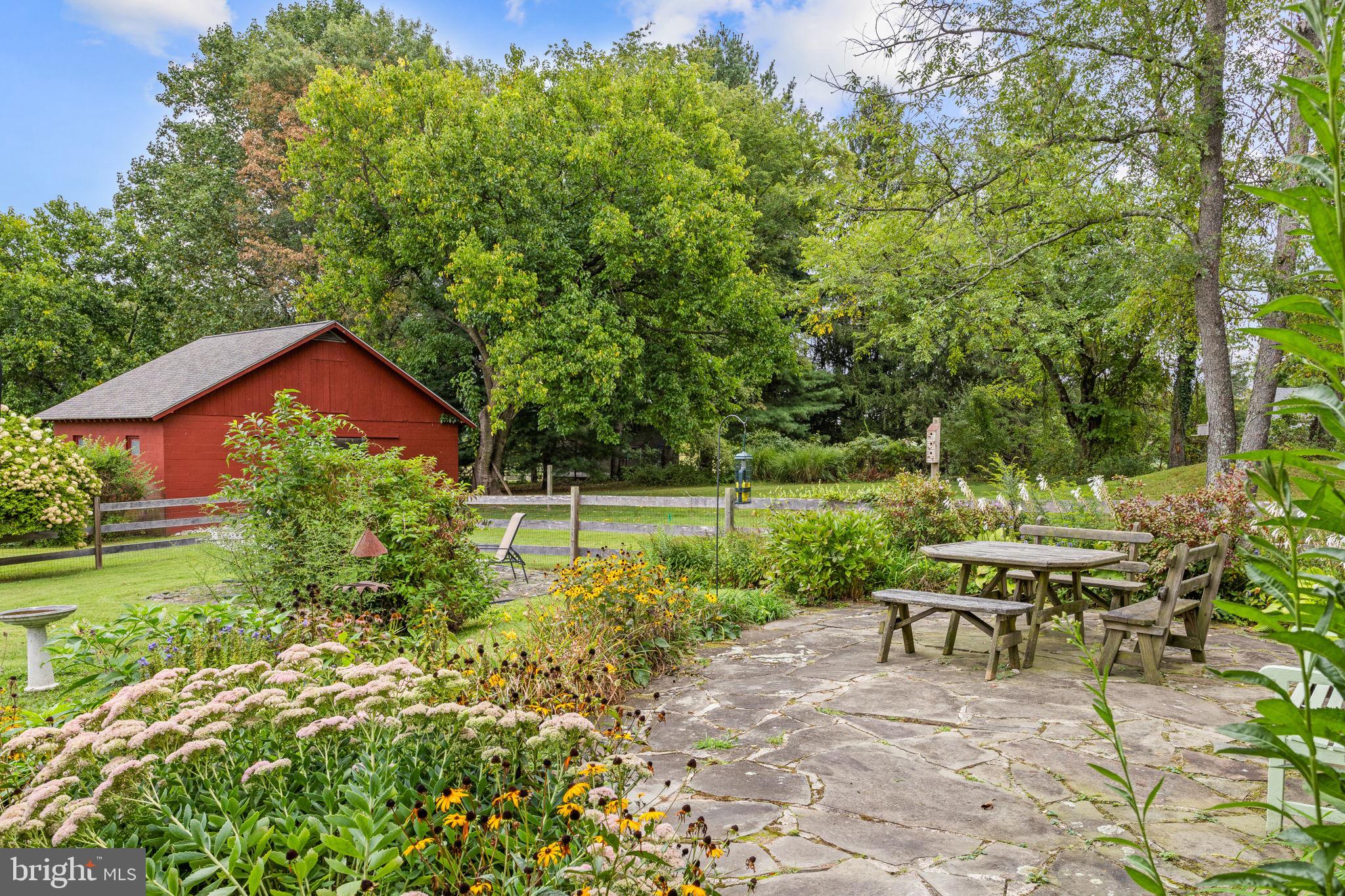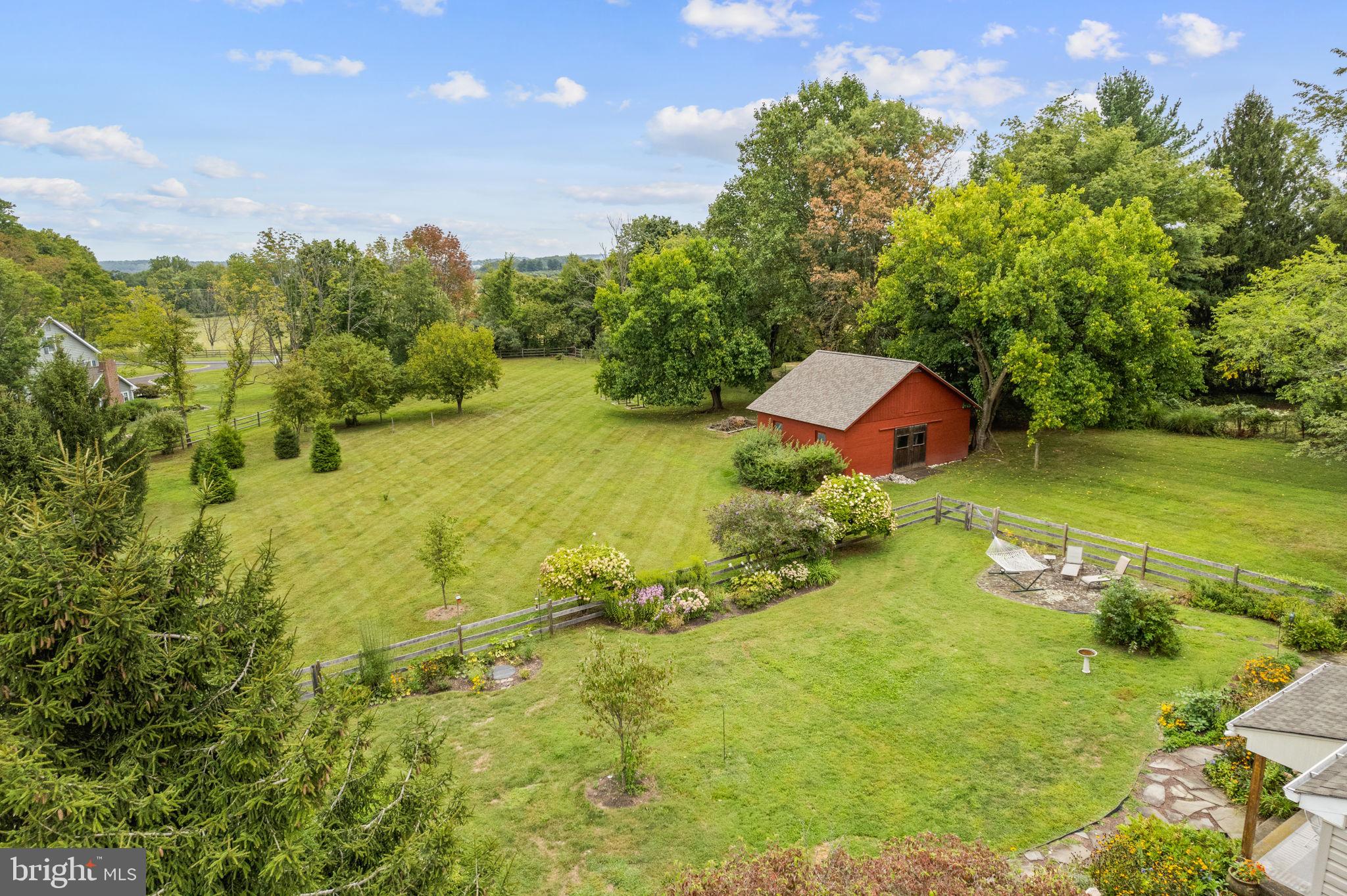 Drive down a quiet country road to be greeted by this charming colonial nestled on over 2 acres of tranquil Bucks County land. Conveniently located within Solebury Township for an easy commute, this 5 bed, 3 bath home warmly welcomes you from the time you step inside. As you approach the front of the home, you will admire the flagstone walkway, colorful garden beds and mature trees, which all contribute to its intriguing curb appeal. Enter the spacious foyer adorn with custom corner bookshelves to find a meticulously maintained interior featuring original hardwood floors and neutral tones. The entrance is flanked by the cozy living room boasting a brick wood burning fireplace and sizeable dining room, both decorated with custom crafted built-ins. Discover many noteworthy features as you make your way around the amazing space including the wide entrance ways, special wall enhancements and the abundant natural light from the perfectly positioned windows and doors. The open gourmet kitchen, with its serene garden views, opens through a set of French doors to a large patio area, creating a seamless flow between indoor and outdoor living. The eat-in kitchen is a chef's dream, boasting rich cabinetry, attractive quartz countertops, a butcher block topped center island, coordinating tile backsplash, new gas range and a useful pantry closet for storage. Adjacent, the family room with its second wood burning fireplace, offers a warm and inviting space to gather or unwind after a long day, especially during the crisp evenings. A hallway off the kitchen houses a convenient laundry room, full bath, and second entryway with easy access to the 2-car garage and backyard rounding out the main level. Retreat upstairs to the roomy primary suite with ample closet space and ensuite full bath featuring tile flooring, newly updated vanity, walk-in shower and dressing area. Four additional bedrooms, each sharing a remodeled stylish hall bathroom complete the second floor. The lower level, currently used for a gym, provides additional living space and awaits your ideas! Outside, the fully fenced-in backyard is surrounded by mature landscape for character and privacy while a sizable patio invites you to relax and enjoy the sounds of nature and tranquility. A neighboring barn on the property offers versatility--originally utilized for raising horses this space would be ideal for a car enthusiast, handyman's workshop or simply extra storage for lawn equipment and more. Come and explore the timeless appeal of this home and the serene surroundings where charm meets modern convenience and custom finishes elevate every room.