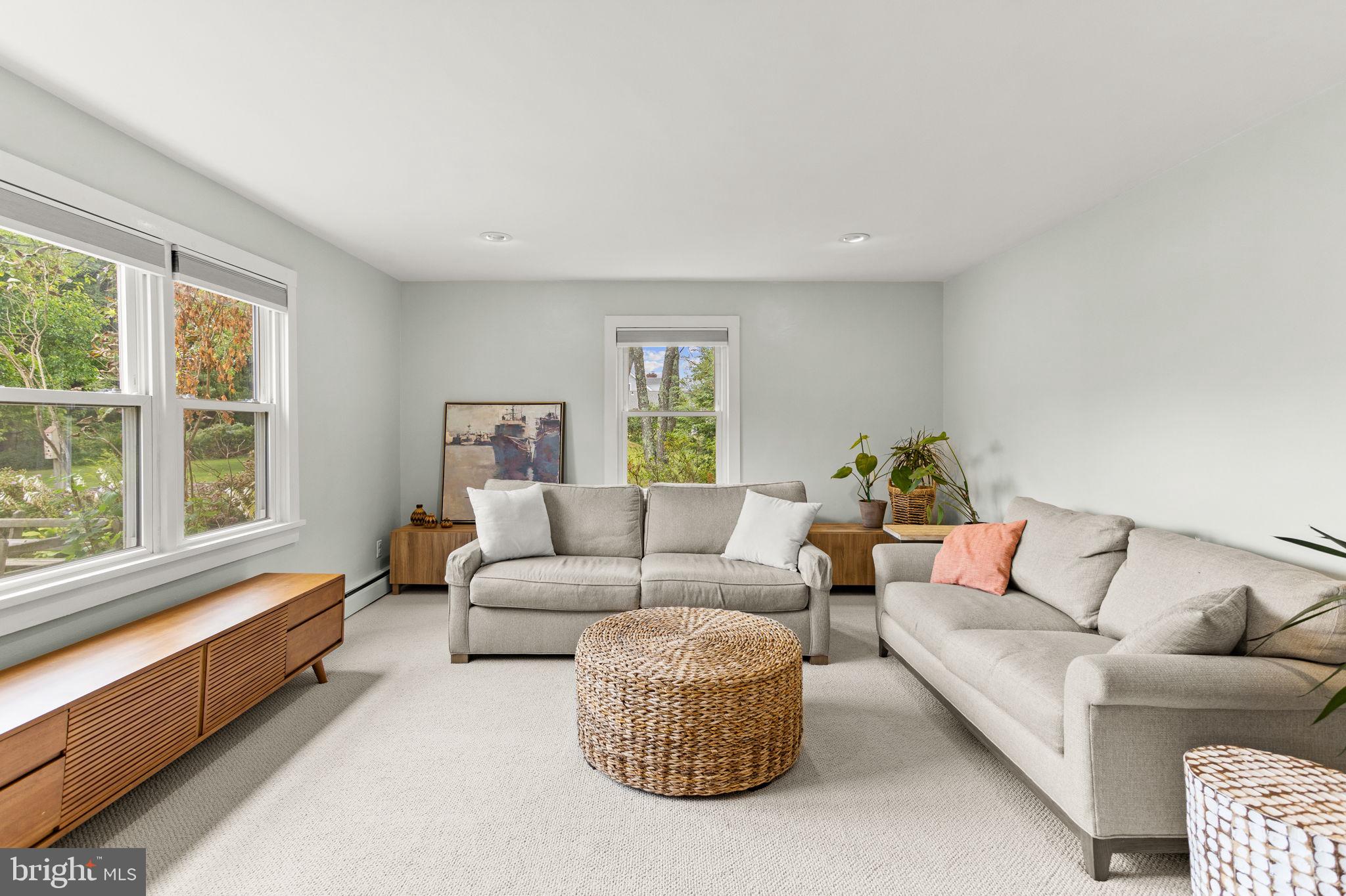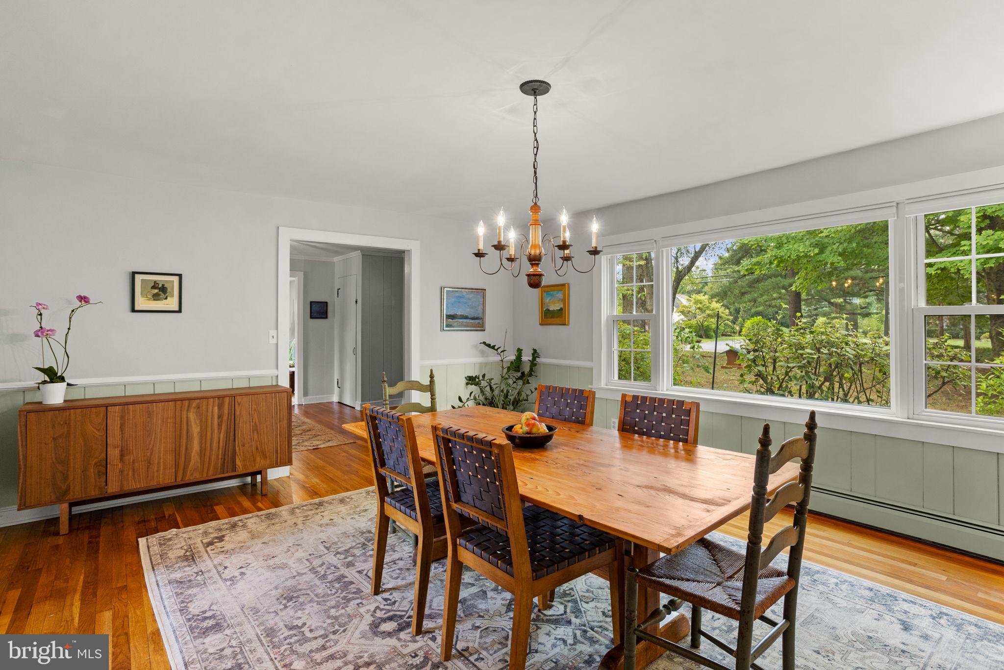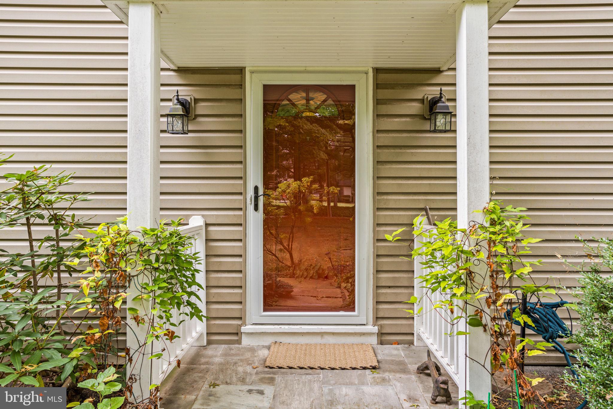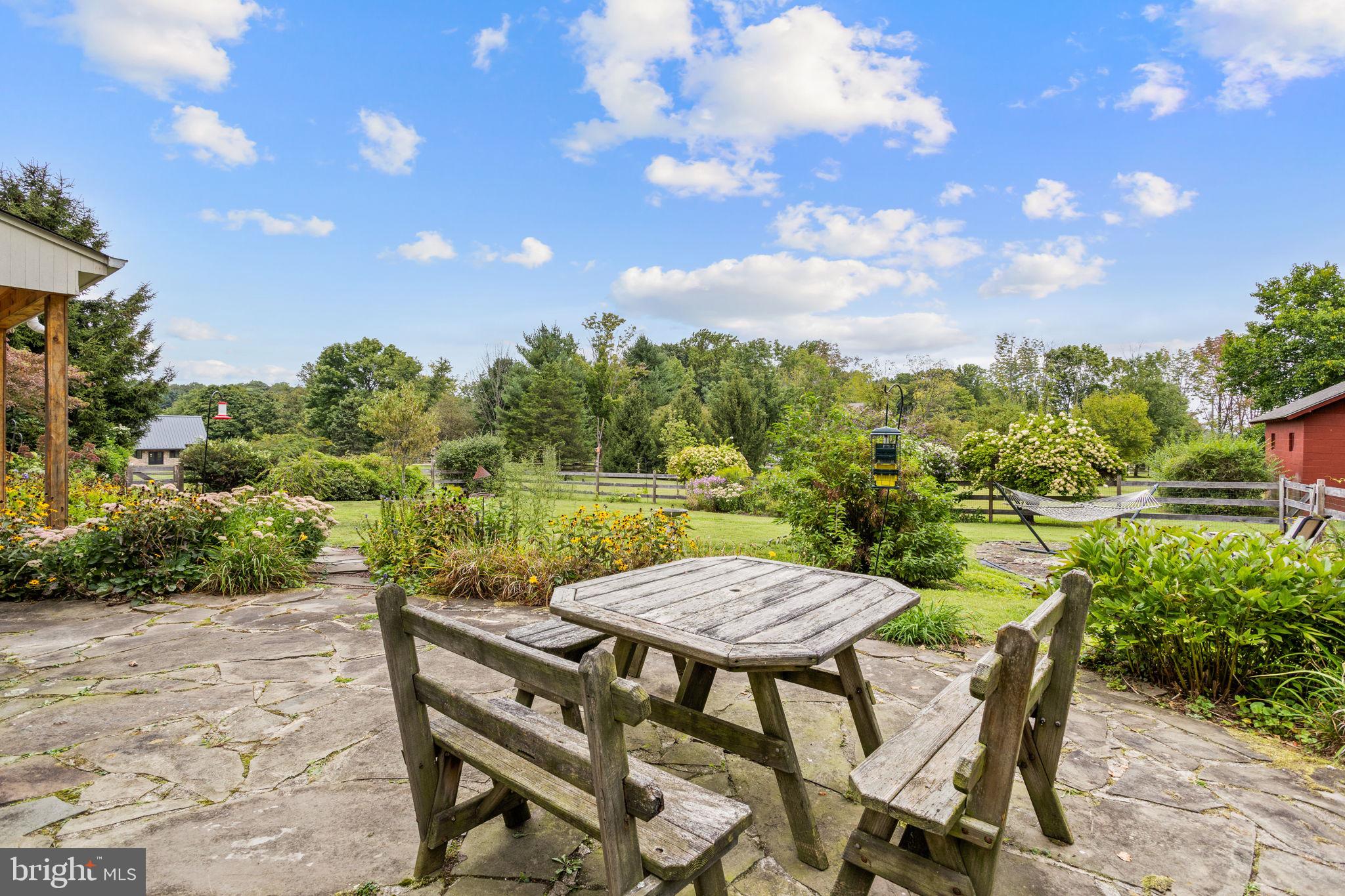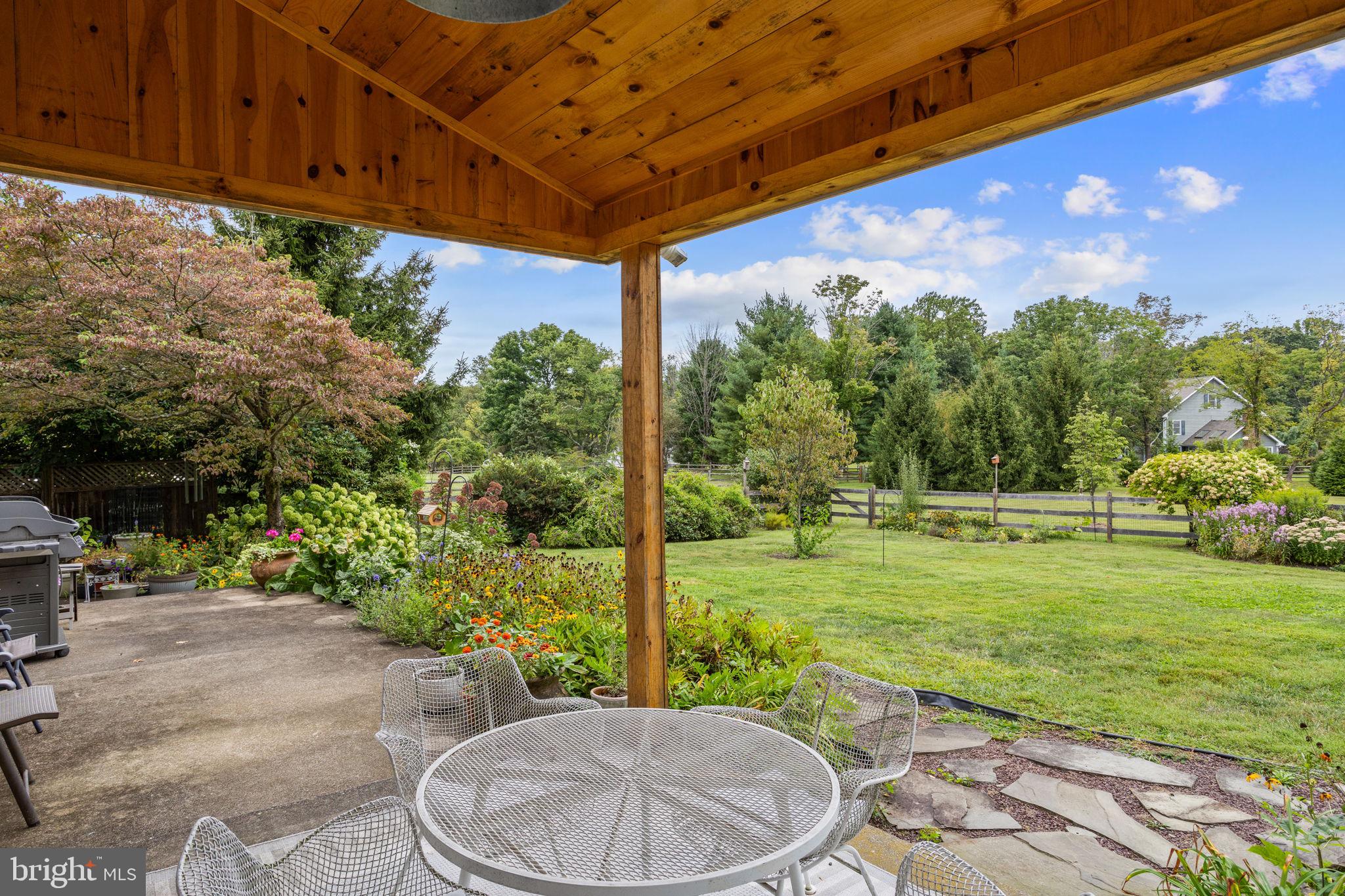 Drive down a quiet country road to be greeted by this charming colonial nestled on over 2 acres of tranquil Bucks County land. Conveniently located within Solebury Township for an easy commute, this 5 bed, 3 bath home warmly welcomes you from the time you step inside. As you approach the front of the home, you will admire the flagstone walkway, colorful garden beds and mature trees, which all contribute to its intriguing curb appeal. Enter the spacious foyer adorn with custom corner bookshelves to find a meticulously maintained interior featuring original hardwood floors and neutral tones. The entrance is flanked by the cozy living room boasting a brick wood burning fireplace and sizeable dining room, both decorated with custom crafted built-ins. Discover many noteworthy features as you make your way around the amazing space including the wide entrance ways, special wall enhancements and the abundant natural light from the perfectly positioned windows and doors. The open gourmet kitchen, with its serene garden views, opens through a set of French doors to a large patio area, creating a seamless flow between indoor and outdoor living. The eat-in kitchen is a chef's dream, boasting rich cabinetry, attractive quartz countertops, a butcher block topped center island, coordinating tile backsplash, new gas range and a useful pantry closet for storage. Adjacent, the family room with its second wood burning fireplace, offers a warm and inviting space to gather or unwind after a long day, especially during the crisp evenings. A hallway off the kitchen houses a convenient laundry room, full bath, and second entryway with easy access to the 2-car garage and backyard rounding out the main level. Retreat upstairs to the roomy primary suite with ample closet space and ensuite full bath featuring tile flooring, newly updated vanity, walk-in shower and dressing area. Four additional bedrooms, each sharing a remodeled stylish hall bathroom complete the second floor. The lower level, currently used for a gym, provides additional living space and awaits your ideas! Outside, the fully fenced-in backyard is surrounded by mature landscape for character and privacy while a sizable patio invites you to relax and enjoy the sounds of nature and tranquility. A neighboring barn on the property offers versatility--originally utilized for raising horses this space would be ideal for a car enthusiast, handyman's workshop or simply extra storage for lawn equipment and more. Come and explore the timeless appeal of this home and the serene surroundings where charm meets modern convenience and custom finishes elevate every room.