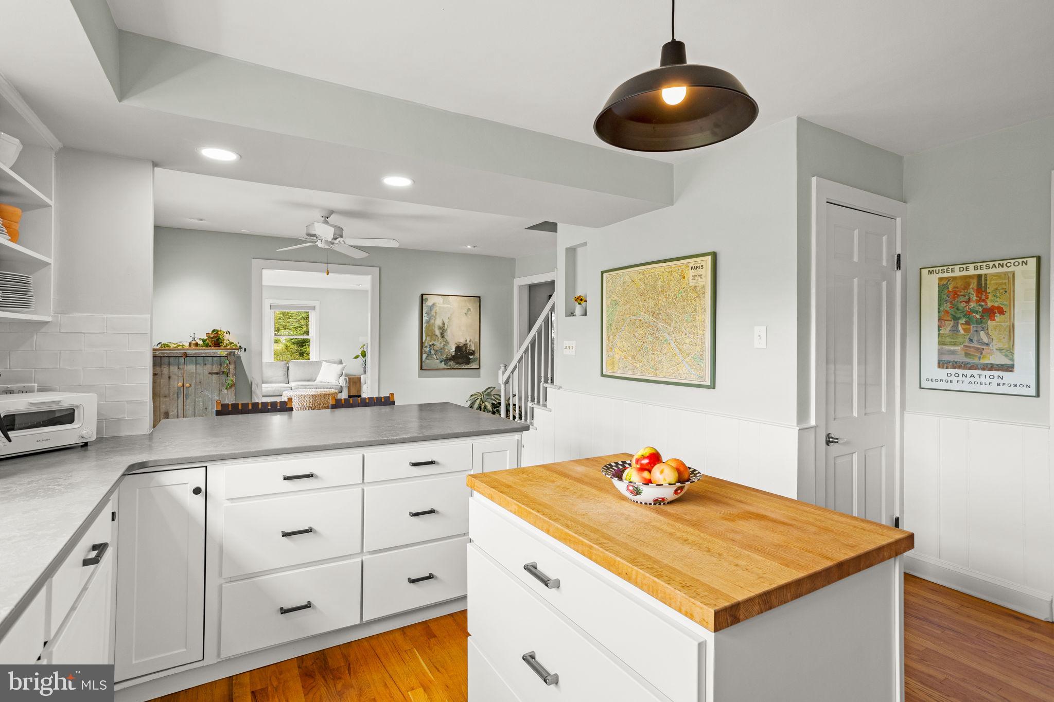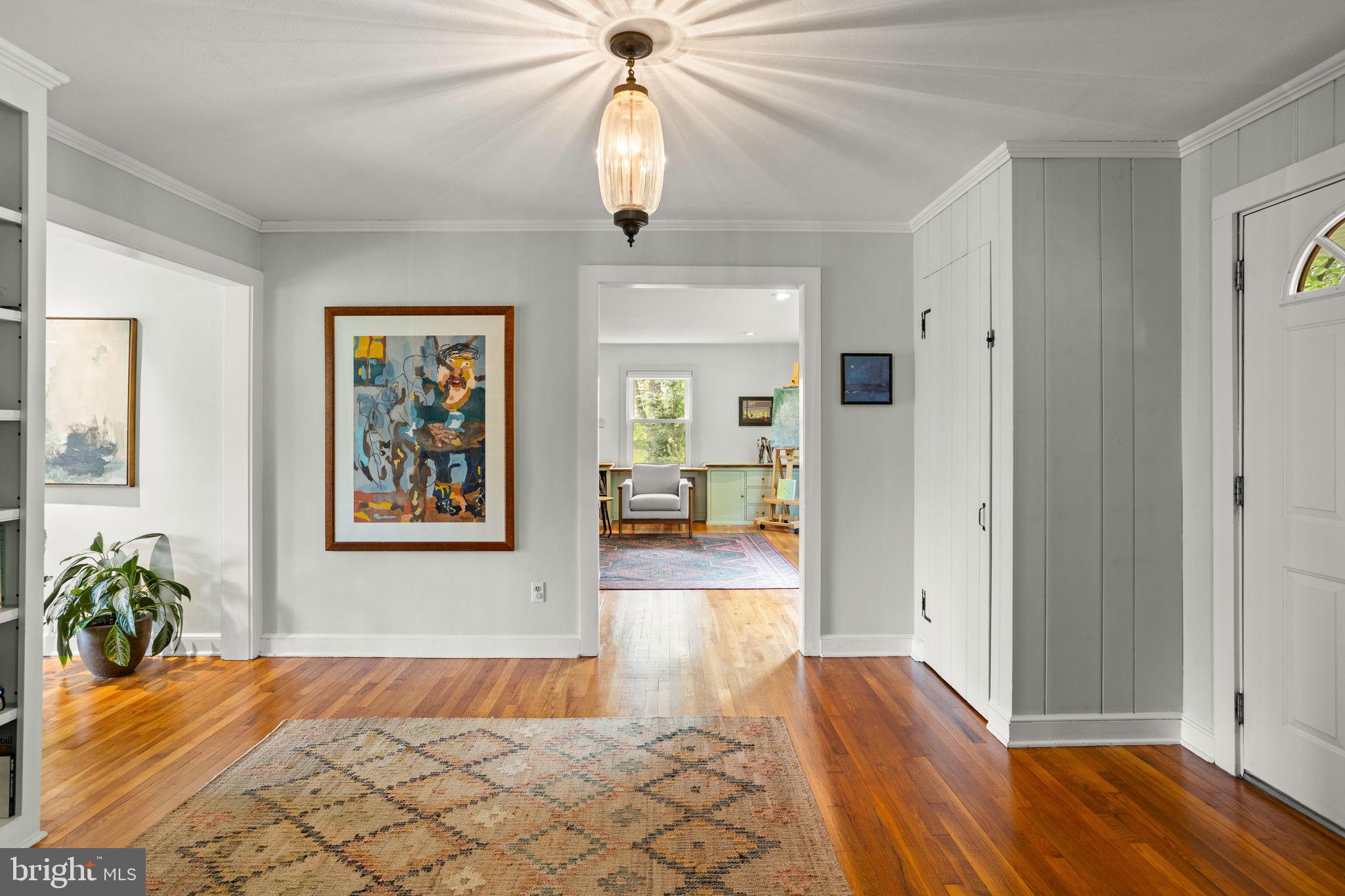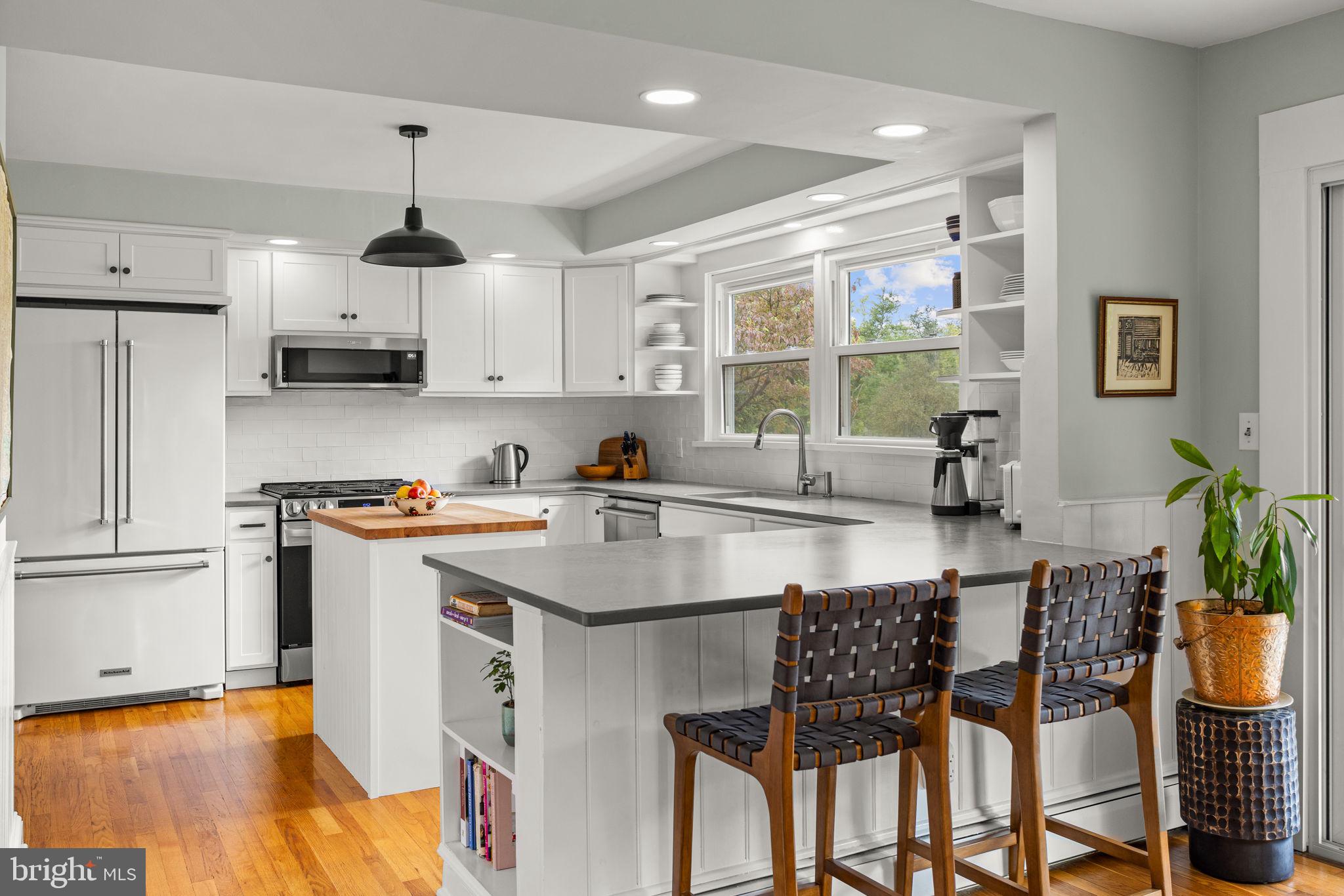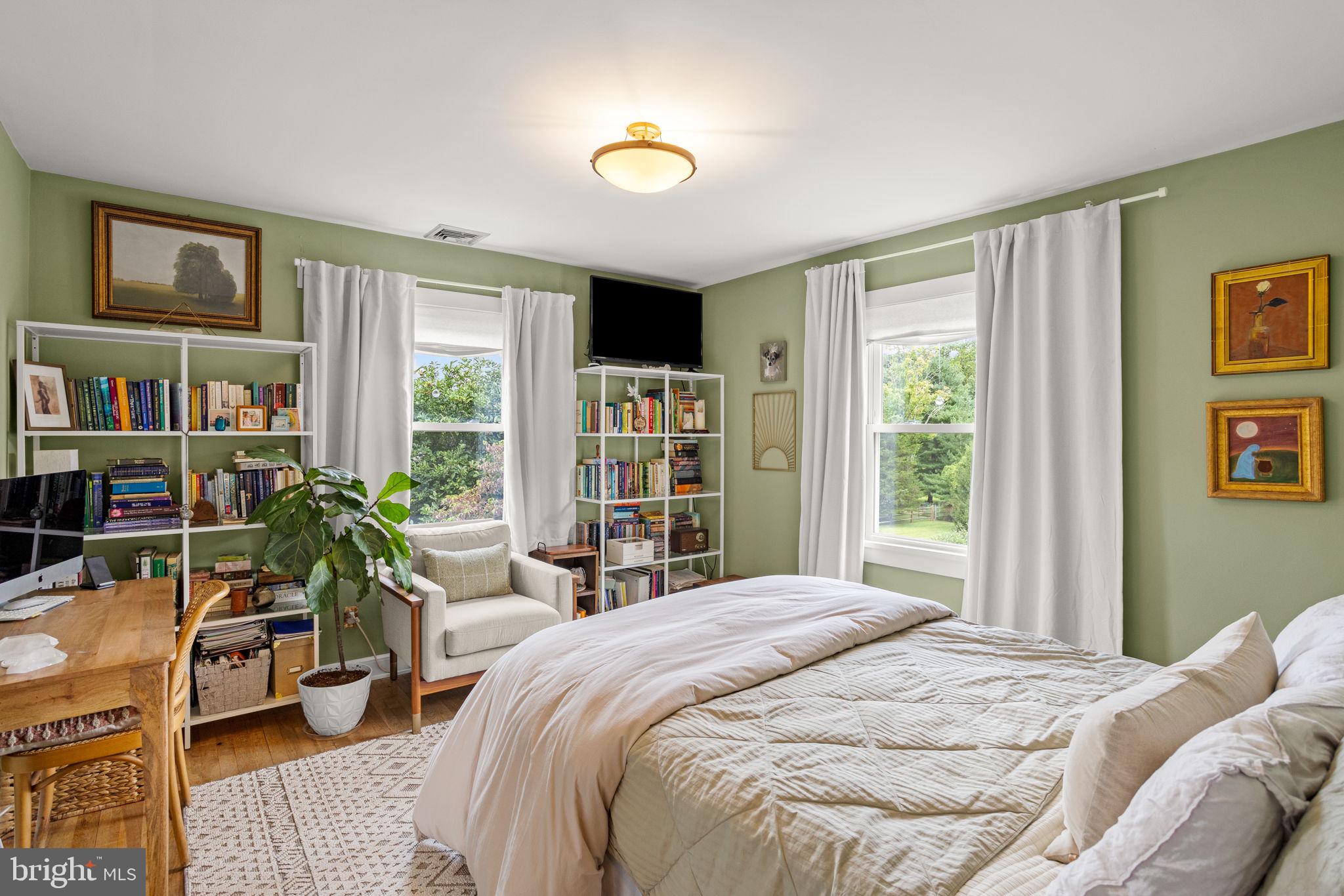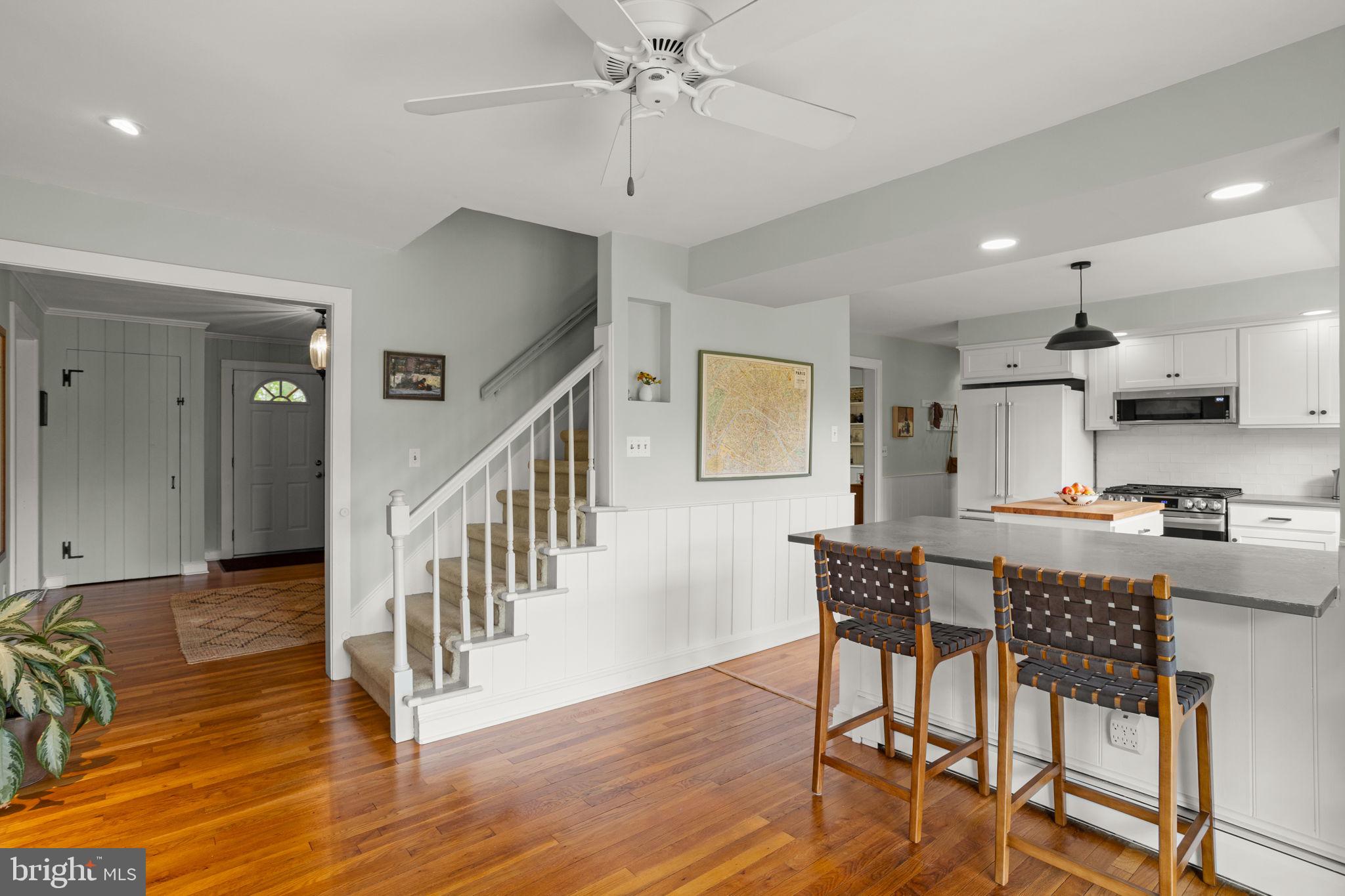 Drive down a quiet country road to be greeted by this charming colonial nestled on over 2 acres of tranquil Bucks County land. Conveniently located within Solebury Township for an easy commute, this 5 bed, 3 bath home warmly welcomes you from the time you step inside. As you approach the front of the home, you will admire the flagstone walkway, colorful garden beds and mature trees, which all contribute to its intriguing curb appeal. Enter the spacious foyer adorn with custom corner bookshelves to find a meticulously maintained interior featuring original hardwood floors and neutral tones. The entrance is flanked by the cozy living room boasting a brick wood burning fireplace and sizeable dining room, both decorated with custom crafted built-ins. Discover many noteworthy features as you make your way around the amazing space including the wide entrance ways, special wall enhancements and the abundant natural light from the perfectly positioned windows and doors. The open gourmet kitchen, with its serene garden views, opens through a set of French doors to a large patio area, creating a seamless flow between indoor and outdoor living. The eat-in kitchen is a chef's dream, boasting rich cabinetry, attractive quartz countertops, a butcher block topped center island, coordinating tile backsplash, new gas range and a useful pantry closet for storage. Adjacent, the family room with its second wood burning fireplace, offers a warm and inviting space to gather or unwind after a long day, especially during the crisp evenings. A hallway off the kitchen houses a convenient laundry room, full bath, and second entryway with easy access to the 2-car garage and backyard rounding out the main level. Retreat upstairs to the roomy primary suite with ample closet space and ensuite full bath featuring tile flooring, newly updated vanity, walk-in shower and dressing area. Four additional bedrooms, each sharing a remodeled stylish hall bathroom complete the second floor. The lower level, currently used for a gym, provides additional living space and awaits your ideas! Outside, the fully fenced-in backyard is surrounded by mature landscape for character and privacy while a sizable patio invites you to relax and enjoy the sounds of nature and tranquility. A neighboring barn on the property offers versatility--originally utilized for raising horses this space would be ideal for a car enthusiast, handyman's workshop or simply extra storage for lawn equipment and more. Come and explore the timeless appeal of this home and the serene surroundings where charm meets modern convenience and custom finishes elevate every room.